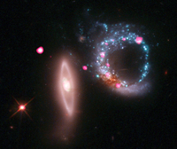 Giant Ring of Black Holes: A galaxy about 430 million light years from Earth Esta imagen compuesta de Arp 147 muestra el par de galaxias en interacción en luz de rayos X de Chandra (rosa) y datos ópticos del Hubble (rojo, verde, azul). Arp 147 contiene el remanente de una galaxia espiral (derecha) que colisionó con la galaxia elíptica de la izquierda, lo que desencadenó una ola expansiva de formación estelar. Las estrellas jóvenes y masivas completan su rápida evolución en unos pocos millones de años o menos y explotan como supernovas, dejando tras de sí estrellas de neutrones y agujeros negros. Algunos de estos agujeros negros se observan como fuentes de rayos X alrededor del anillo de la espiral.