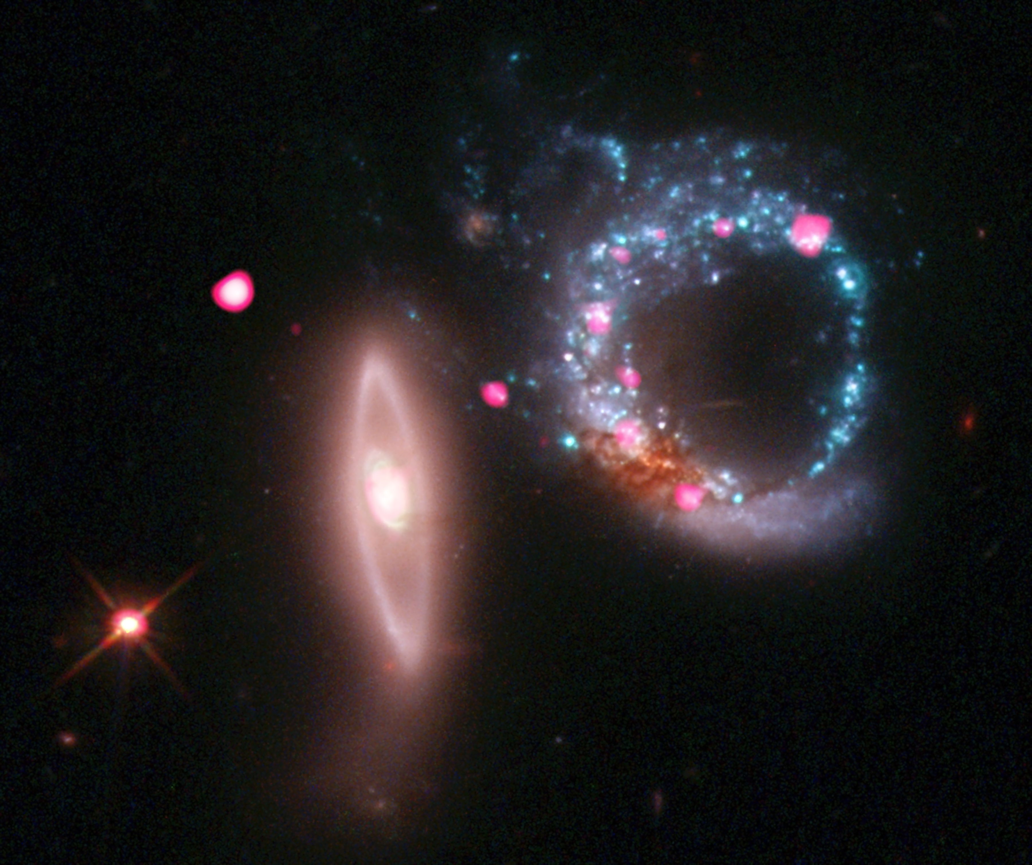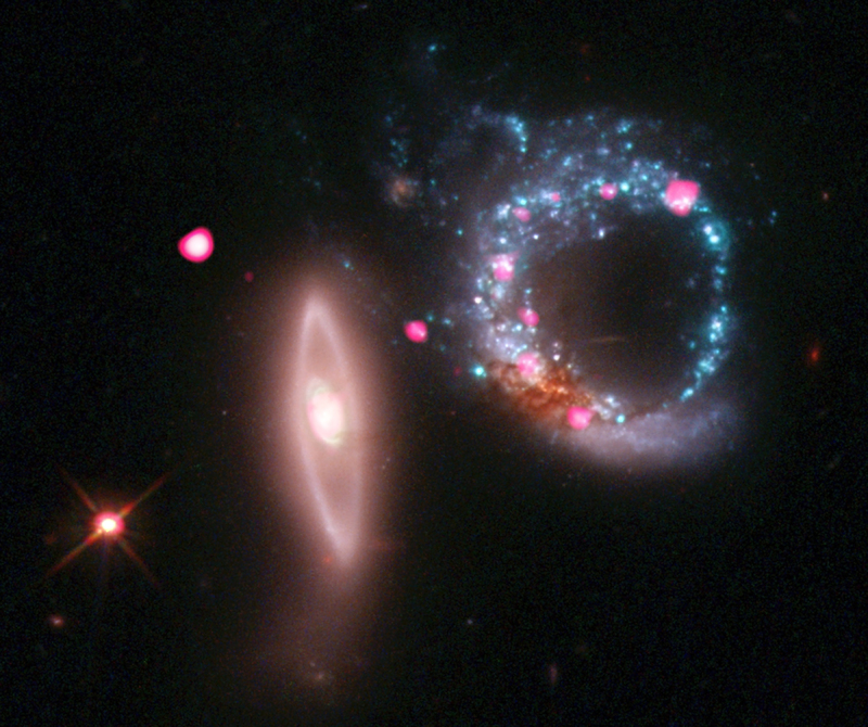 Esta imagen compuesta de Arp 147 muestra el par de galaxias en interacción en luz de rayos X de Chandra (rosa) y datos ópticos del Hubble (rojo, verde, azul). Arp 147 contiene el remanente de una galaxia espiral (derecha) que colisionó con la galaxia elíptica de la izquierda, lo que desencadenó una ola expansiva de formación estelar. Las estrellas jóvenes y masivas completan su rápida evolución en unos pocos millones de años o menos y explotan como supernovas, dejando tras de sí estrellas de neutrones y agujeros negros. Algunos de estos agujeros negros se observan como fuentes de rayos X alrededor del anillo de la espiral.