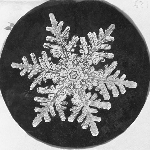 Wilson A. Bentley se fascinó con la nieve durante su infancia en una granja de Vermont, y experimentó durante años con formas de observar copos de nieve individuales para estudiar su estructura cristalina. Finalmente, conectó una cámara a su microscopio y, en 1885, fotografió con éxito los copos. Esta fotomicrografía y más de cinco mil más respaldaron la creencia de que no hay dos copos de nieve iguales, lo que llevó a los científicos a estudiar su trabajo y publicarlo en numerosos artículos y revistas científicas. En 1903, Bentley envió impresiones de sus copos de nieve al Smithsonian, con la esperanza de que pudieran ser de interés para el secretario Samuel P. Langley.