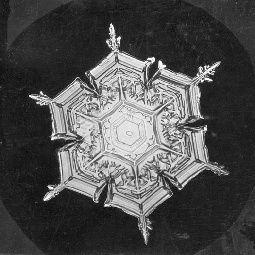Wilson A. Bentley se fascinó con la nieve durante su infancia en una granja de Vermont, y experimentó durante años con formas de observar copos de nieve individuales para estudiar su estructura cristalina. Finalmente, conectó una cámara a su microscopio y, en 1885, fotografió con éxito los copos. Esta fotomicrografía y más de cinco mil más respaldaron la creencia de que no hay dos copos de nieve iguales, lo que llevó a los científicos a estudiar su trabajo y publicarlo en numerosos artículos y revistas científicas. En 1903, Bentley envió impresiones de sus copos de nieve al Smithsonian, con la esperanza de que pudieran ser de interés para el secretario Samuel P. Langley.