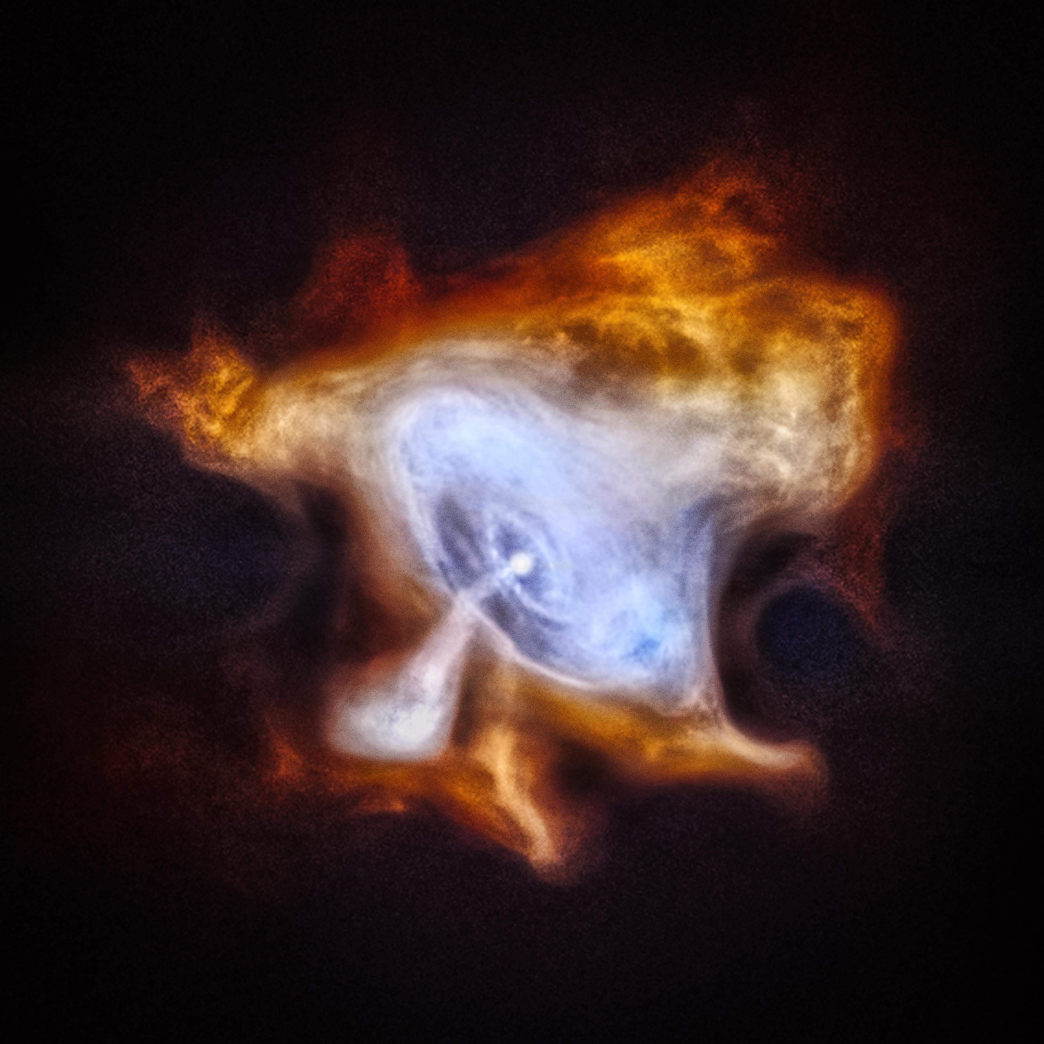 In 1054 AD, Chinese astronomers and others around the world noticed a new bright object in the sky. This “new star” was, in fact, the supernova explosion that created what is now called the Crab Nebula. At the center of the Crab Nebula is an extremely dense, rapidly rotating neutron star left behind by the explosion. The neutron star, also known as a pulsar, is spewing out a blizzard of high-energy particles, producing the expanding X-ray nebula seen by Chandra. In this new image, lower-energy X-rays from Chandra are red, medium energy X-rays are green, and the highest-energy X-rays are blue.