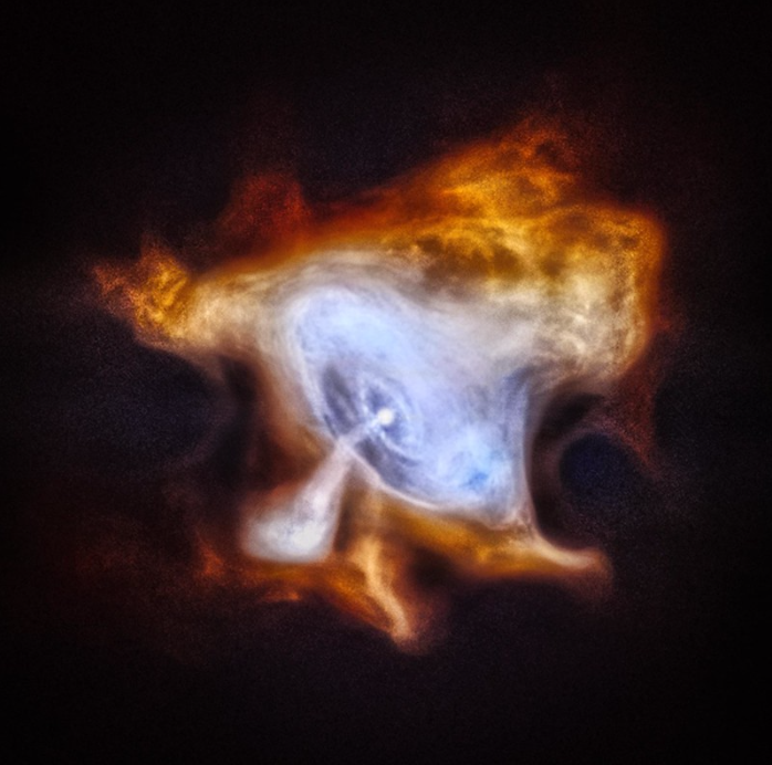 In 1054 AD, Chinese astronomers and others around the world noticed a new bright object in the sky. This “new star” was, in fact, the supernova explosion that created what is now called the Crab Nebula. At the center of the Crab Nebula is an extremely dense, rapidly rotating neutron star left behind by the explosion. The neutron star, also known as a pulsar, is spewing out a blizzard of high-energy particles, producing the expanding X-ray nebula seen by Chandra. In this new image, lower-energy X-rays from Chandra are red, medium energy X-rays are green, and the highest-energy X-rays are blue.