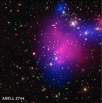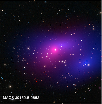 These galaxy clusters are part of a large study using Chandra and Hubble that sets new limits on how dark matter - the mysterious substance that makes up most of the matter in the Universe - interacts with itself. The hot gas that envelopes the clusters glows brightly in X-rays detected by Chandra (pink). When combined with Hubble's visible light data, astronomers can map where the stars and hot gas are after the collision, as well as the inferred distribution of dark matter (blue) through the effect of gravitational lensing.